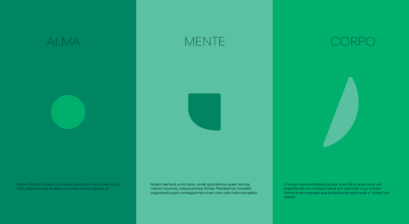 - Alma, simbolizada por um círculo posicionado no topo, remetendo à leveza e espiritualidade;